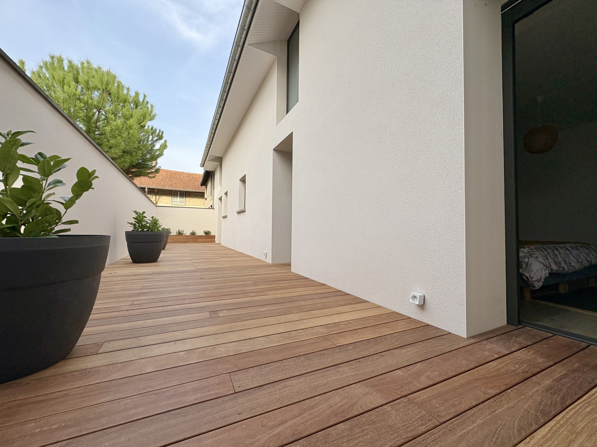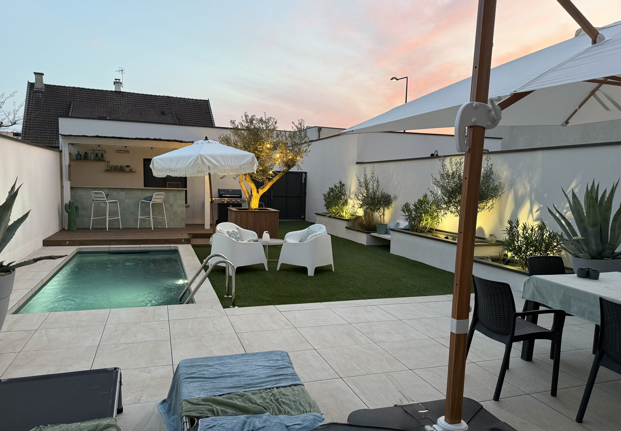 Au centre de la maison, un patio aménagé avec salon extérieur et braséro constitue un espace indépendant et intimiste. Le jardin paysager exposé Sud/Sud-Ouest accueille quant à lui une piscine et un pool house dans un environnement calme.